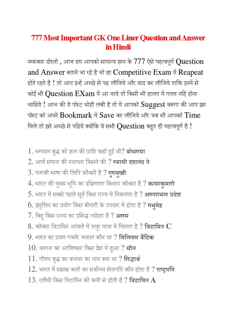 दोस्तों आप सभी जानते है कि सभी तरह के प्रतियोगी परीक्षा में आजकल objective question ही रहते हैं और इसलिए सभी विषयों से संबंधित objective questions पढ़ना बहुत जरूरी हो गया है। Get gk questions in hindi with general knowledge question on history questionss in hindi. Gk in hindi find current gk in hindi and also exams quiz on janral nolej samanya gyan. नमस्कार दोस्तो , आज हम आपको सामान्य ज्ञान के 777 ऐसे महत्वपूर्ण question and answer बताने जा रहे है जो हर competitive exam में reapeat होते रहते है !